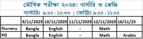 * নার্সারি ও কেজি শ্রেণিতে মৌখিক পরীক্ষার দিন অন্যকোন ক্লাস অনুষ্ঠিত হবে না।